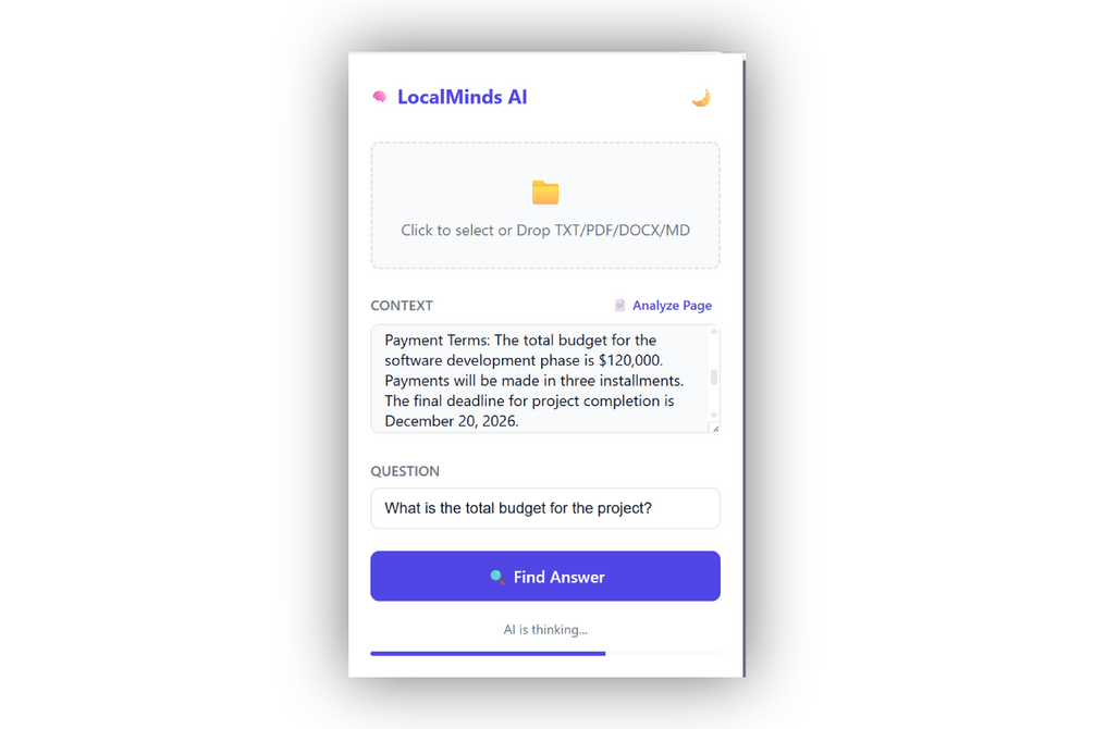 LocalMinds AI is a privacy-first Chrome Extension that runs a Large Language Model (LLM) entirely within your browser. It utilizes WebAssembly and Transformers.js to execute the LaMini-Flan-T5-248M model locally on your CPU.