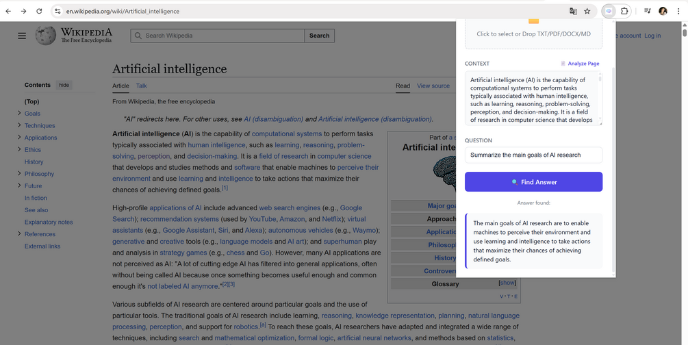 - Context Menu Integration: Select any text on a page, right-click, and send it directly to the AI for instant analysis.
