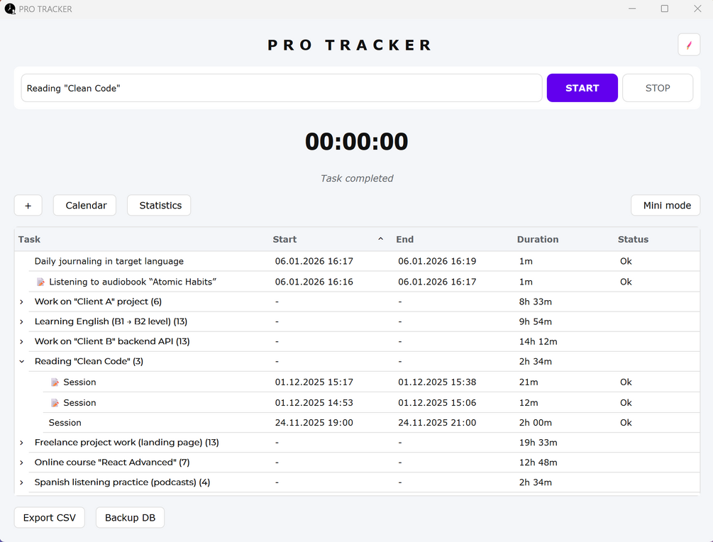 PRO TRACKER Time is a sleek, modern, and high-performance desktop application designed for freelancers, developers, and professionals who value their time. It combines minimalist design with powerful tracking features to help you stay focused and organized.